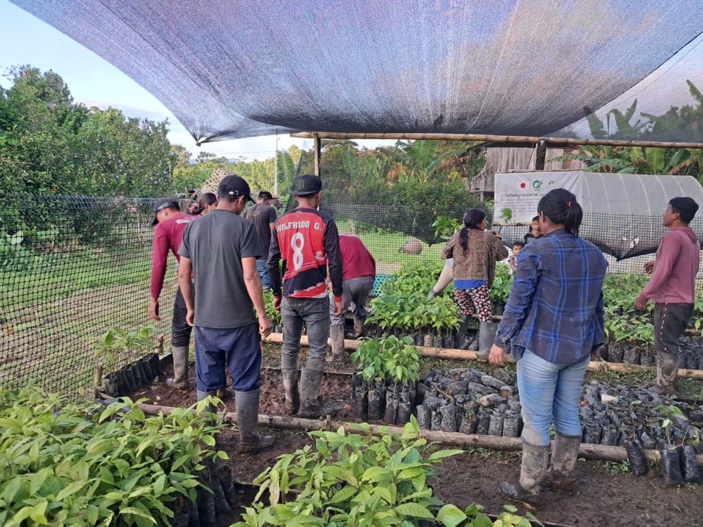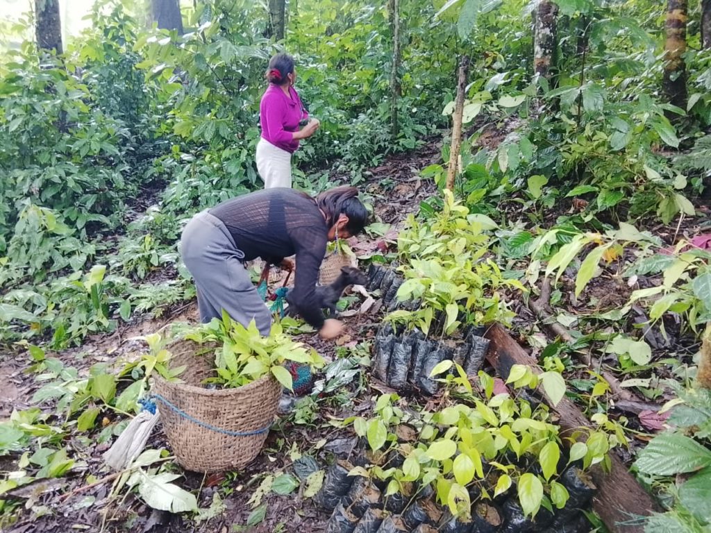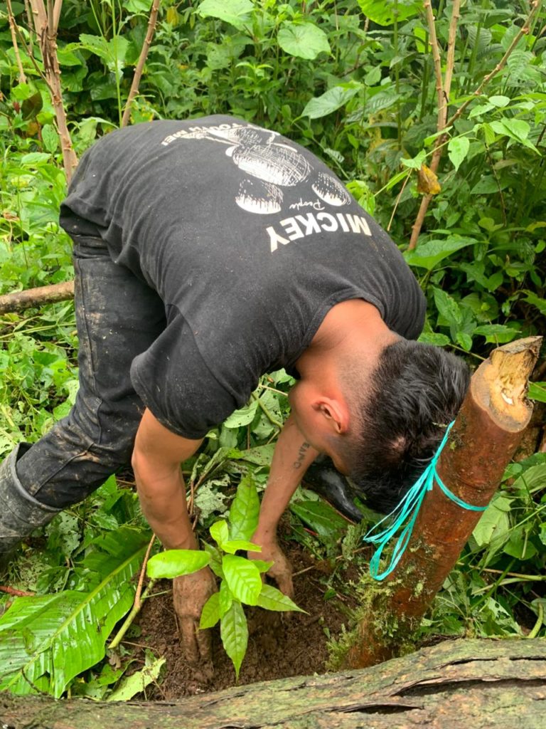 植樹の前に、キチュア族の伝統的な共同作業文化である「ミンガ(Minga)」を通じて、コミュニティ全体で議論を重ねました。 誰がどのエリアに何を植えるのか、28の生産者家庭と技術チーム(パートナー組合Wiñakの5名+現地リーダー1名)コミュニティ全体で緻密な計画を策定。